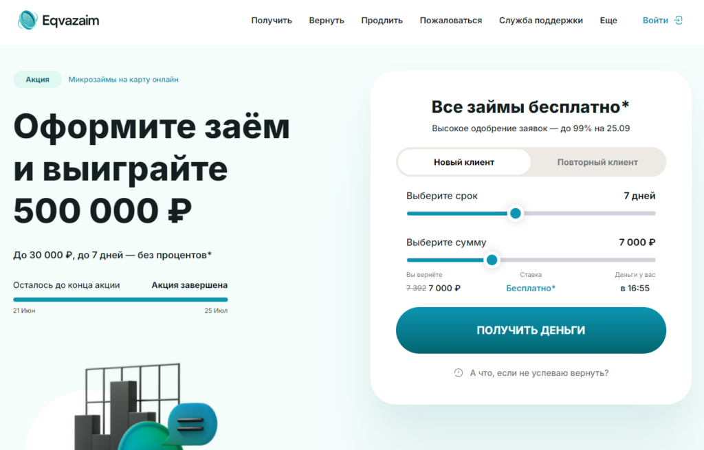 Оформите заём в Эквазайм и примите участие в розыгрыше 500 000 рублей! Не упустите эту уникальную возможность — акция продлится до 25 июля 2024 года.